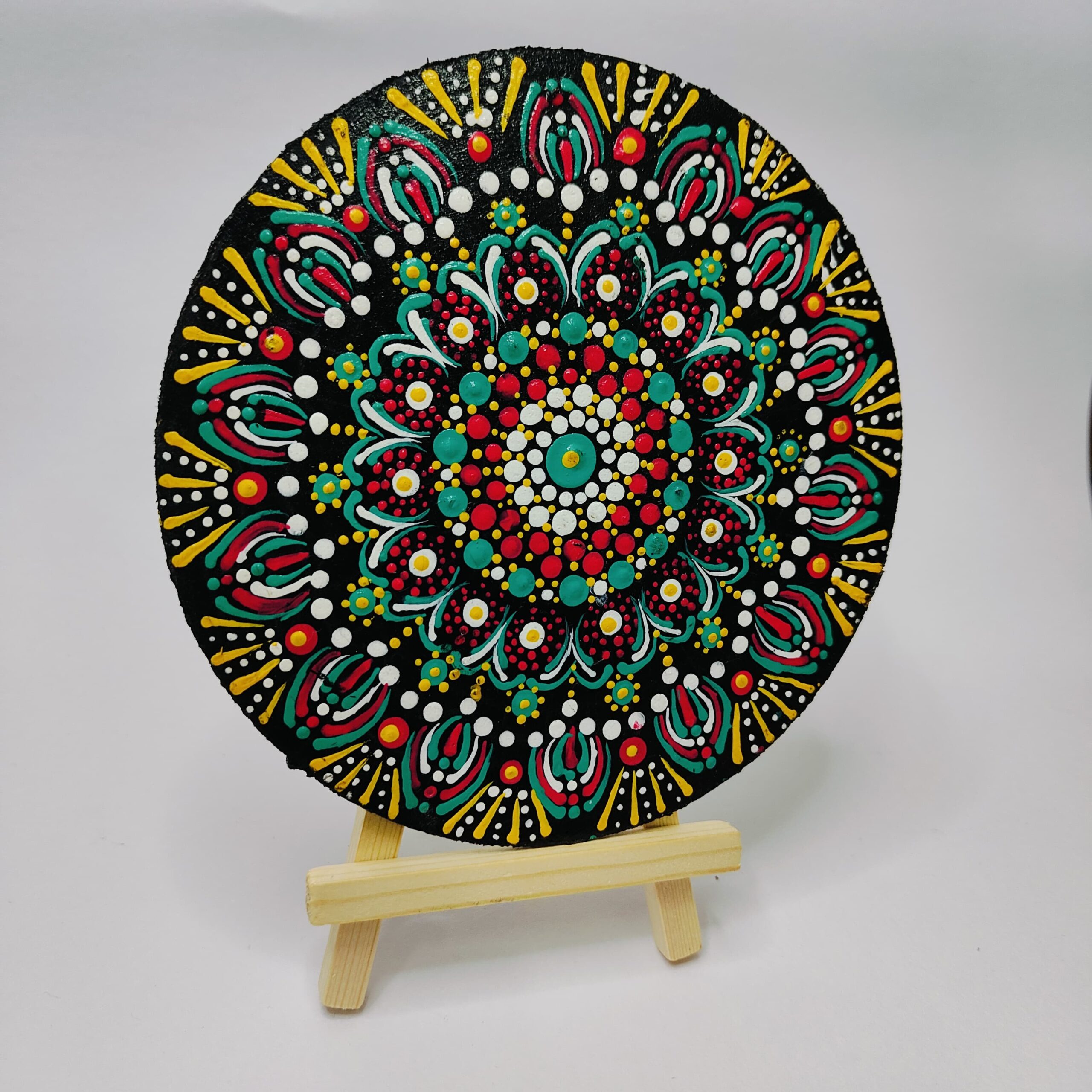 Radiant Harmony is a vibrant dot mandala artwork hand-painted with intricate dot work using color therapy principles. Designed to bring peace and energy, this piece is perfect for your living room, meditation corner, or creative space. The circular symmetry and bright hues radiate positivity and calm.